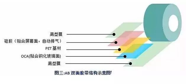AB双面胶带,以PET为基材,一面是硅胶、一面是OCA的钢化玻璃保护专用的双面胶。其中OCA粘性好、光学性能优越并具备一定的粗糙面填补功能,贴合于钢化玻璃;硅胶自排气泡性能优越,贴合于手机屏幕表面。